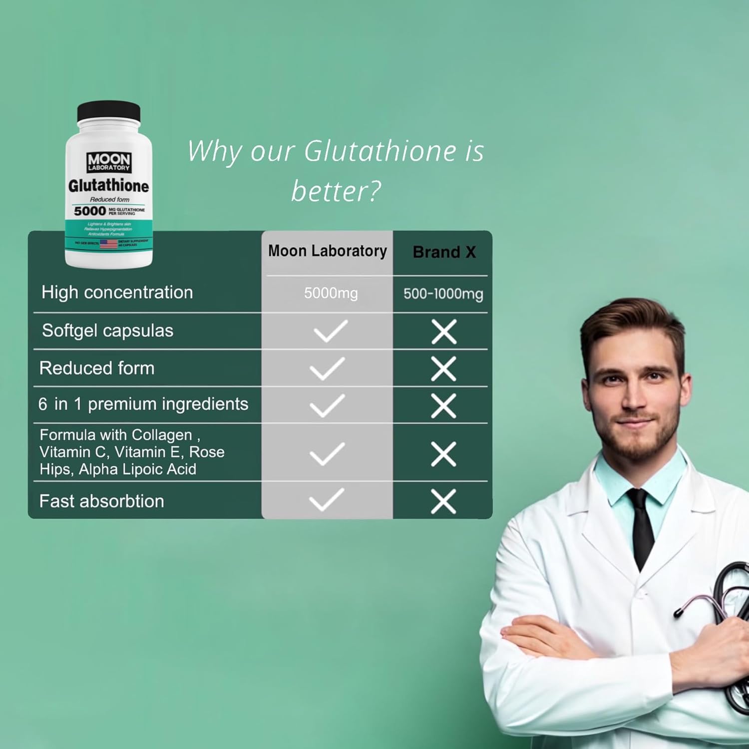 Elevate your magnificence and wellness routine with Moon Laboratory Glutathione, a strong 5000mg antioxidant mix designed for pores and skin brightening, collagen renewal, and mobile detoxing. Crafted with precision, this components combines Glutathione, Vitamin C, Collagen Peptides, Vitamin E, Rose Hips, and Alpha Lipoic Acid (ALA)—every working synergistically to assist radiant pores and skin, enhanced immunity, and youthful vitality.