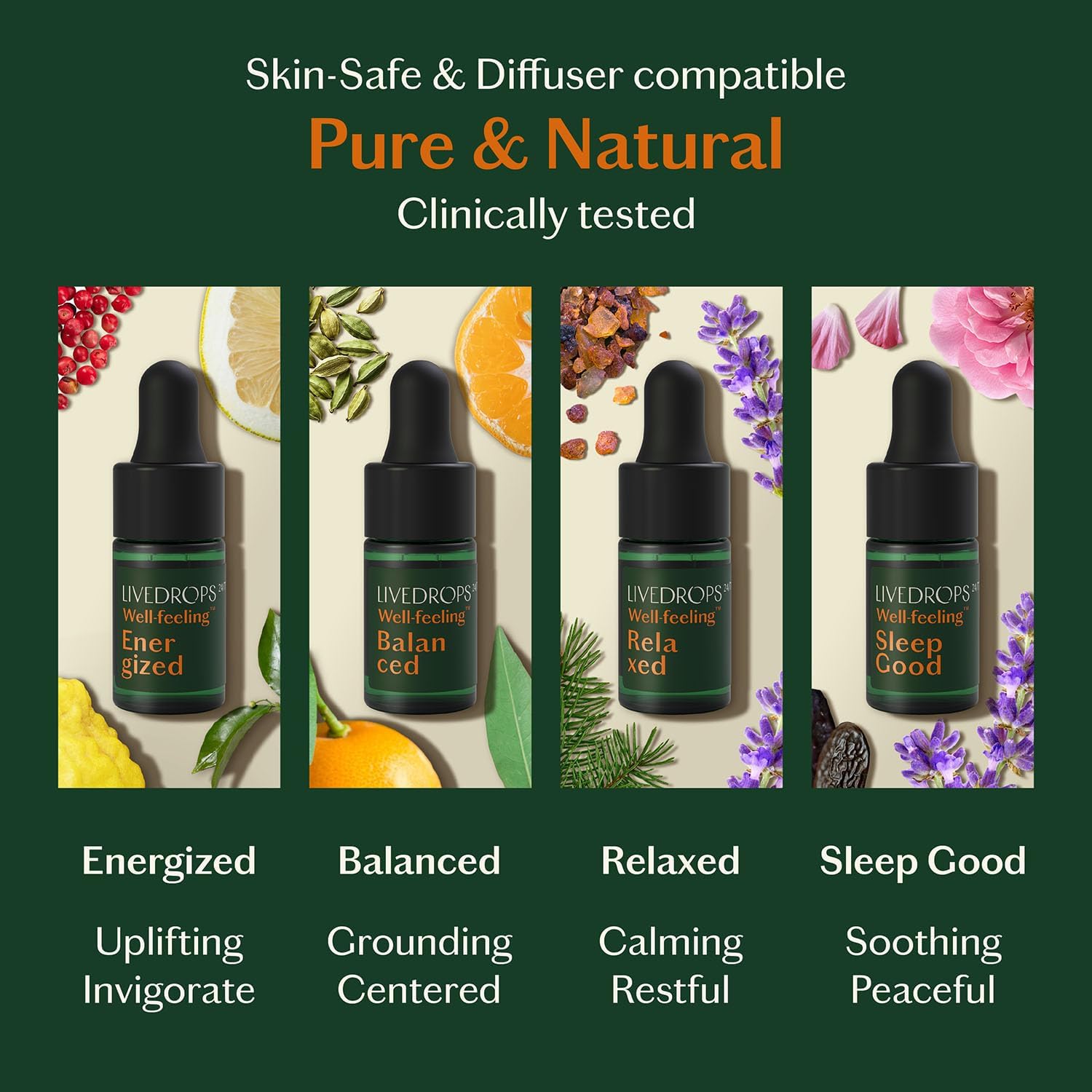 LIVEDROPS 24/7 Essential Oil Gift Set 4 mini Aromatherapy Blends for Energy, Sleep, Relax Natural Oils for Diffuser or Skin Crafted in France by Perfumers Wellness Gift
