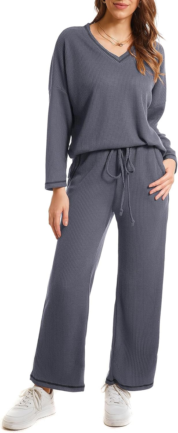 Lounge Sets for Women Waffle Knit Pajamas Set 2 Piece V Neck Top and Long Pant Cozy Sleepwear Loungewear Pjs Set