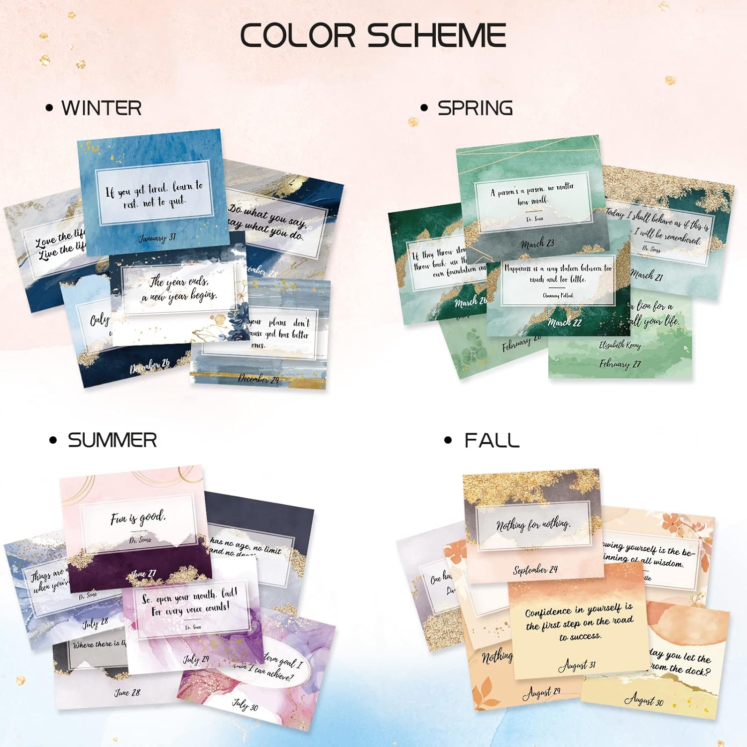 DIMENSIONS: Calendar is 5.5″ x 3.8″USEABLE YEAR AFTER YEAR: No years printed on pages so calendar is perpetualINSPIRATIONAL: 365+ inspirational quotes, affirmations or every day challenges to inspire youPREMIUM FEATURES: Gold foil accents and gloss coating on cowl, sturdy gold foil binding, and design themes that change every day and coordinate with the seasons!Nice present merchandise and the proper desk accent