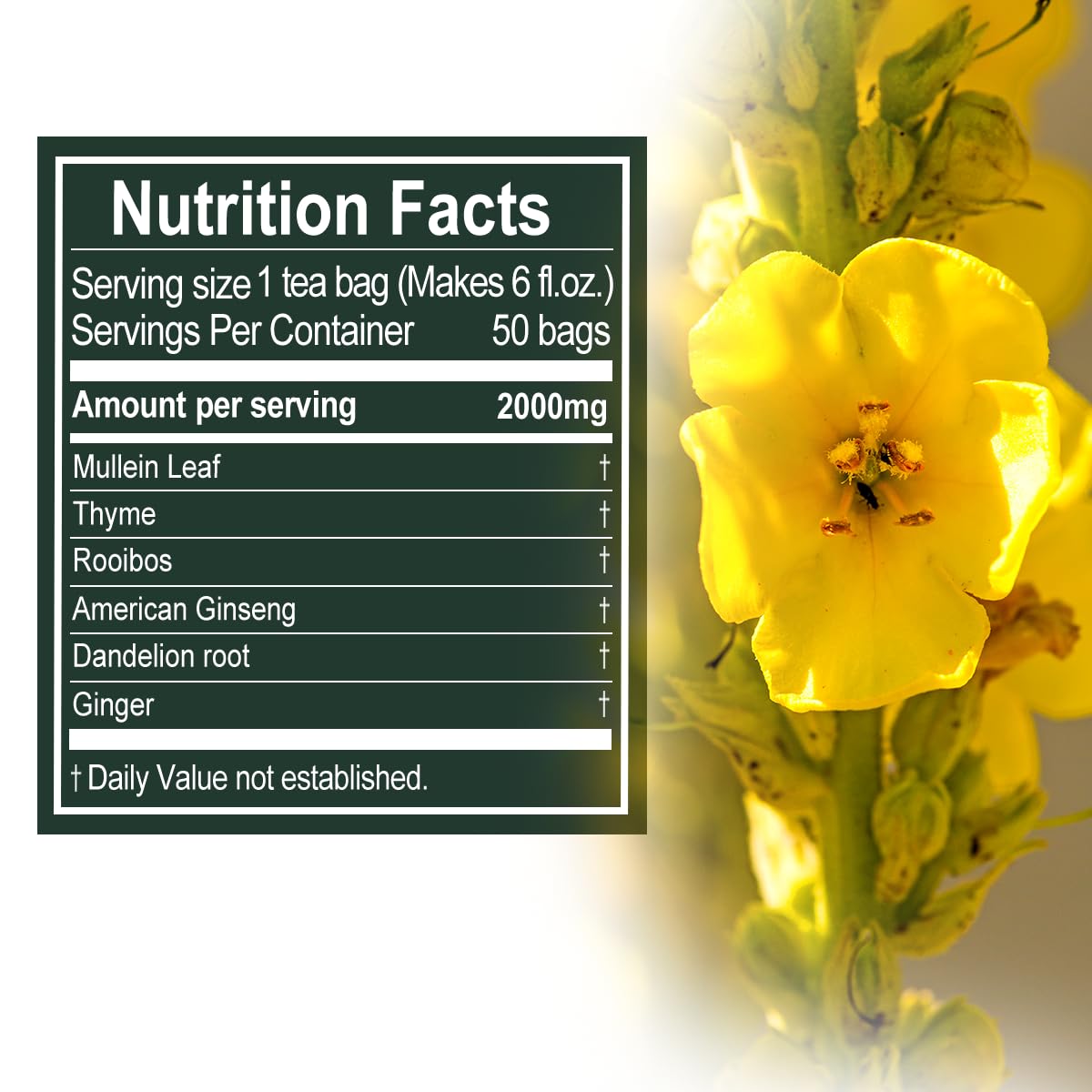 Be the first to review “Mullein leaf Tea for Lungs Detox 50 Tea Bags/3.53Oz | Herbal Blend for Lung Health & Cleanse | Caffeine-Free | Respiratory Support Herbal Tea”