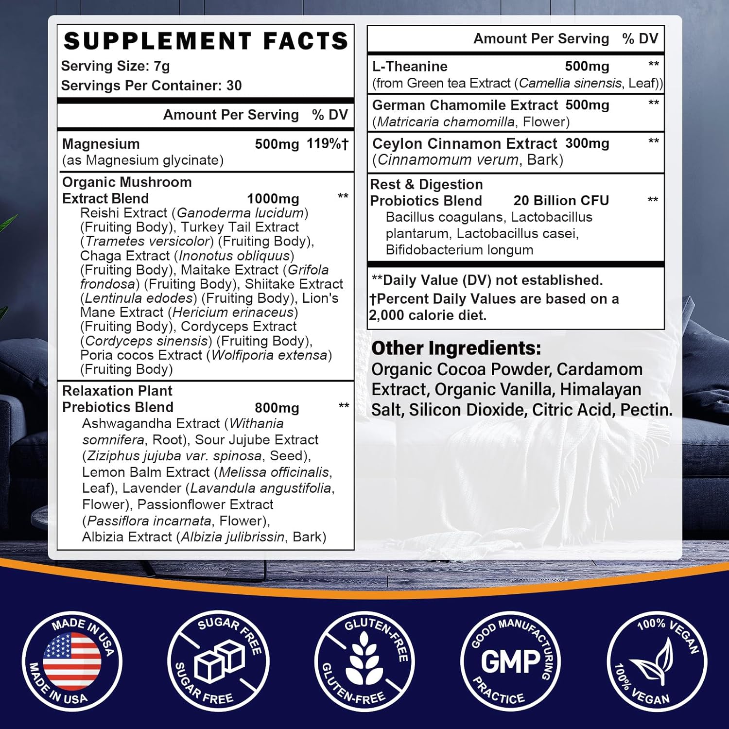 MULTI-TARGET SYNERGISTIC FORMULA – Mushroom scorching cocoa powder is added with L-Theanine, German Chamomile, Passionflower, Lemon Balm, Lavender, Albizia Bark, and Bitter Jujube—a synergistic mixture for sleep, rest, stress reduction, and immune assist. The mushroom scorching chocolate additionally includes a mixture of probiotics and prebiotics, selling intestinal well being and aiding digestion