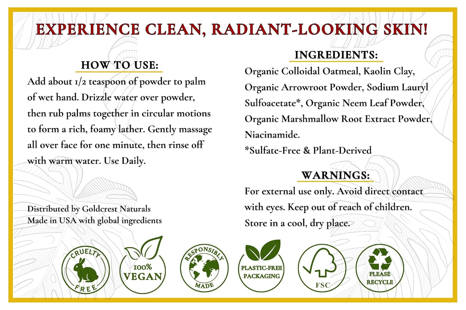Smiling woman with foamy Goldcrest Naturals Face Wash Powder on face. Includes directions for useSmiling woman with foamy Goldcrest Naturals Face Wash Powder on face. Includes directions for use