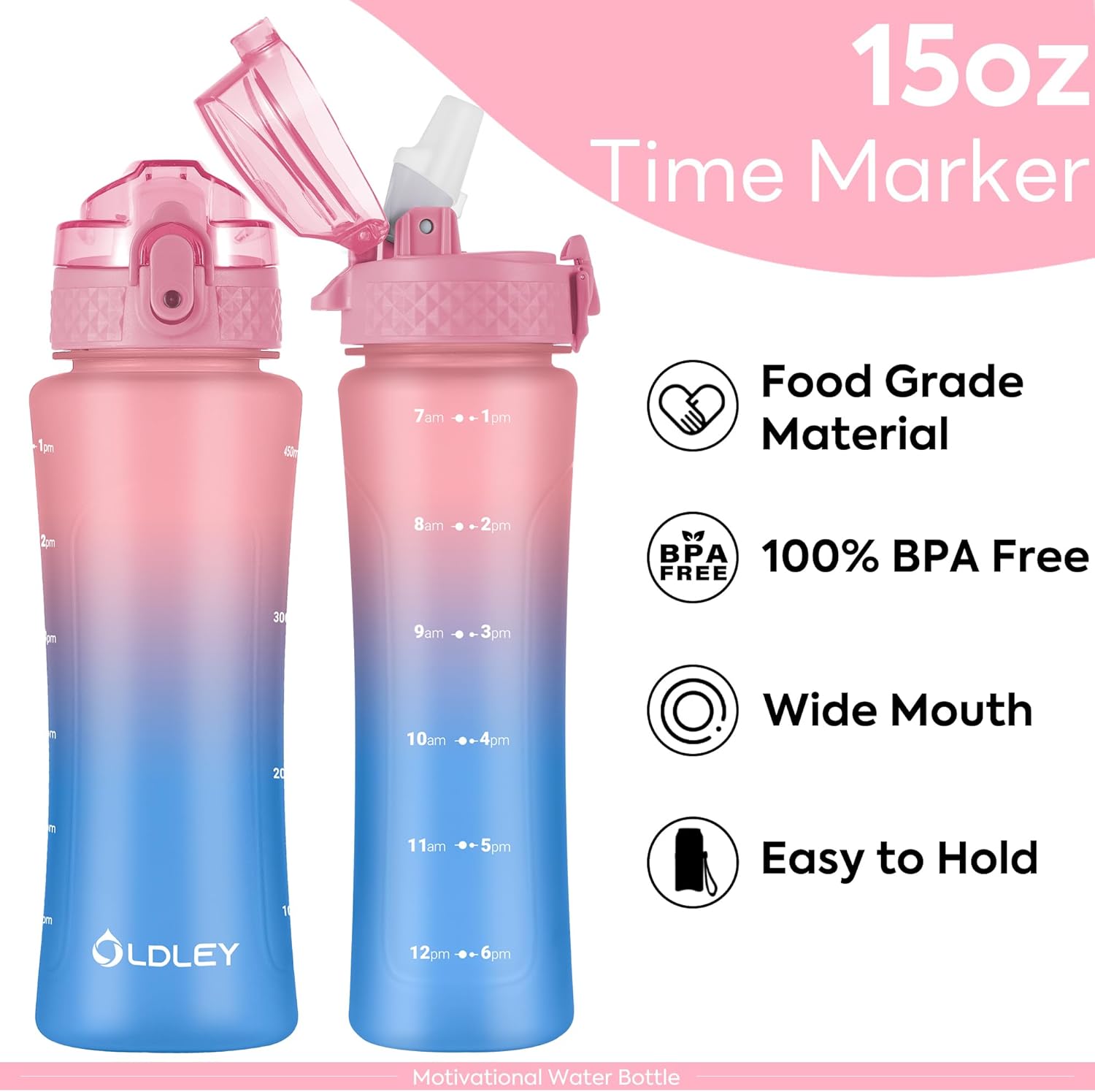 OLDLEY Kids Water Bottle with Straw 15 oz BPA-Free Leak-Proof Motivational Water Bottles with Time Marker for School Sports Travel Gym, Easy to Use for Girls Goys, 1 Straw Lid, Candy Pink/Blueberry