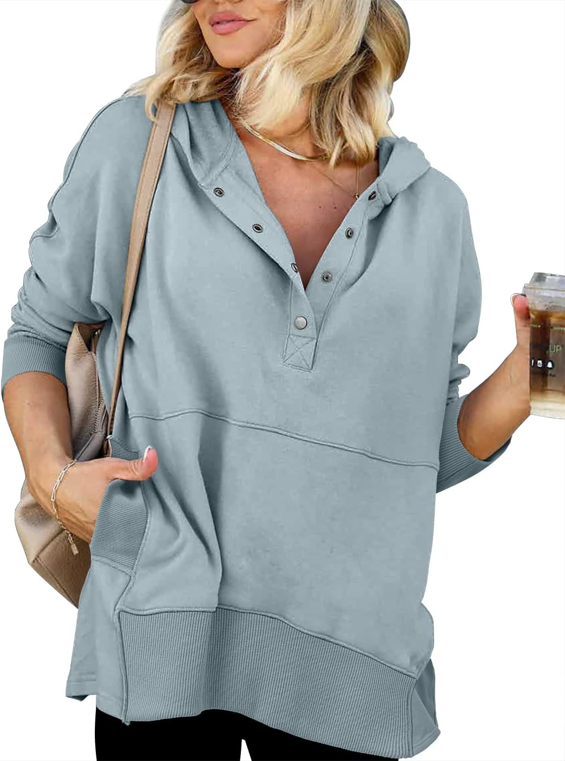 onlypuff WOMEN OVERSIZED V NECK SWEATSHIRT BUTTON DOWN HENLEY HOODIE FASHION TOP