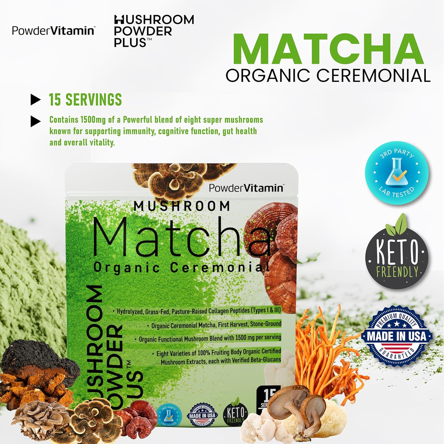 Premium Ceremonial Matcha Mix: PowderVitamin Natural Ceremonial Mushroom Matcha combines vibrant ceremonial-grade matcha with 8 potent fruiting physique mushrooms for focus, vitality, and immune help.