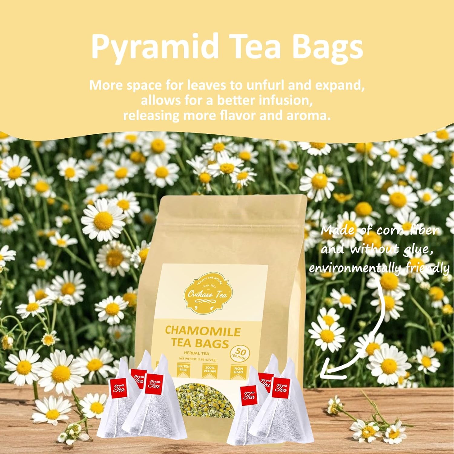 Ovikaso Tea, Chamomile Tea Bags, 50 Pyramid Tea Bags, 1.5g/bag, 100% Natural, Herbal Tea for Relaxation, Direct from Source, Non-GMO, No Caffeine