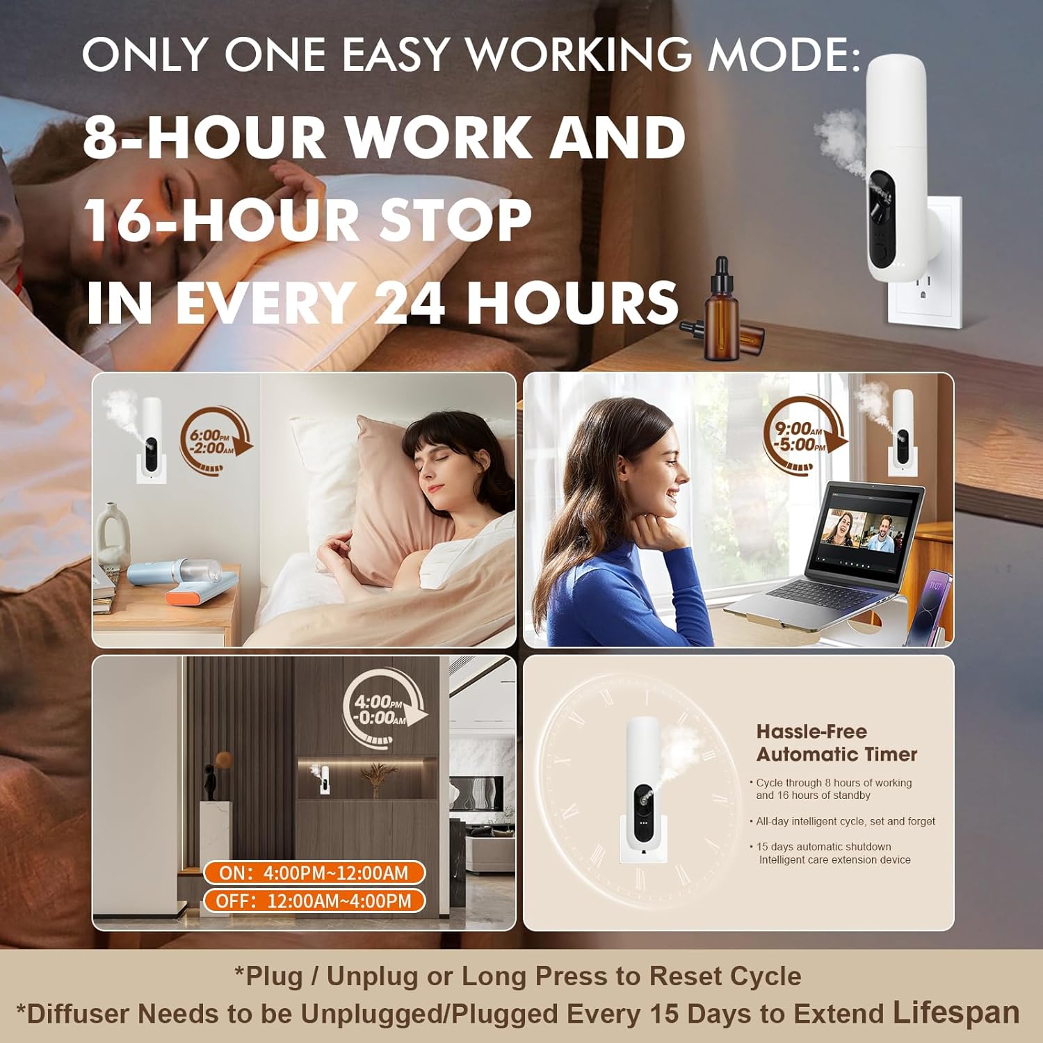 Compact Design: This plug-in scent air machine has a modern, cylindrical form that matches discreetly in small areas like bedrooms, workplaces, or loos.