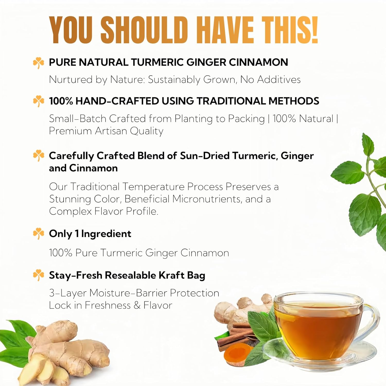 Recent Selecting, Pure Air Drying: Prime quality turmeric, ginger, and cinnamon are picked on the applicable time, washed with water, dried within the solar, floor into the most effective tea measurement primarily based on years of expertise, and thoroughly packaged to keep up their taste and distinctive fragrant impact.