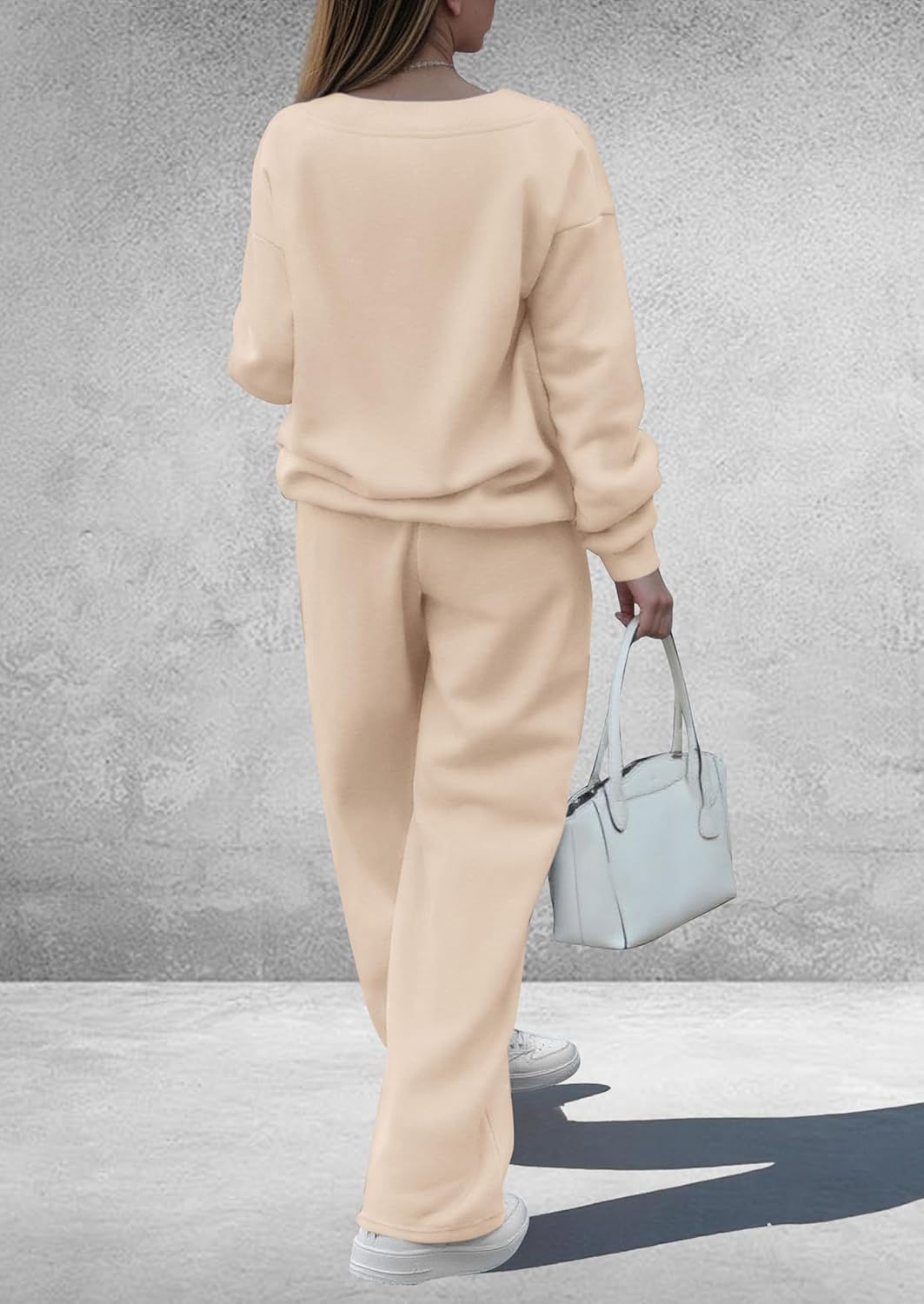 Keep Cozy and Stylish with This V Neck Outsized Sweatshirt and Pocketed Broad Leg Sweatpants Set