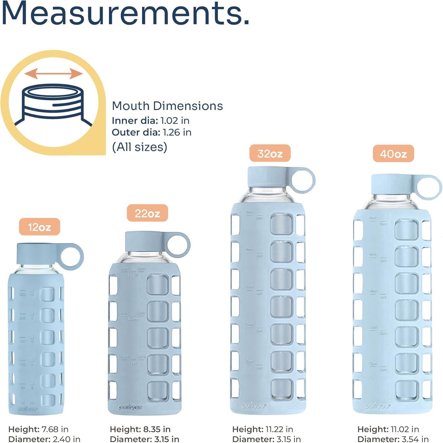 Be the first to review “purifyou 40oz / 32oz / 22oz / 12oz Borosilicate Glass Water Bottle with Time & Volume Markers, Silicone Sleeve, Stainless Steel Lid | Reusable Glass Bottle for Water & Juice (22oz Ice Blue)”