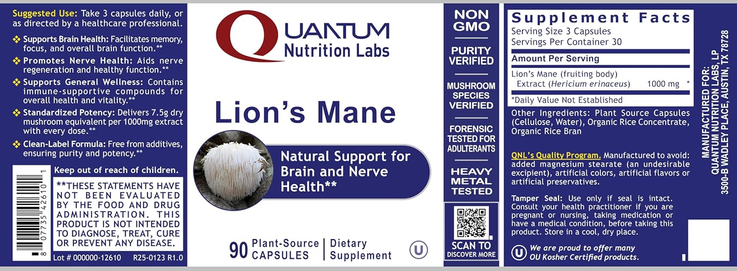 QUANTUM COGNITIVE FORMULA – Quantum Vitamin Labs Lion’s Mane delivers a high-potency, 1000mg premium extract per serving with standardized 20% polysaccharides for superior efficacy