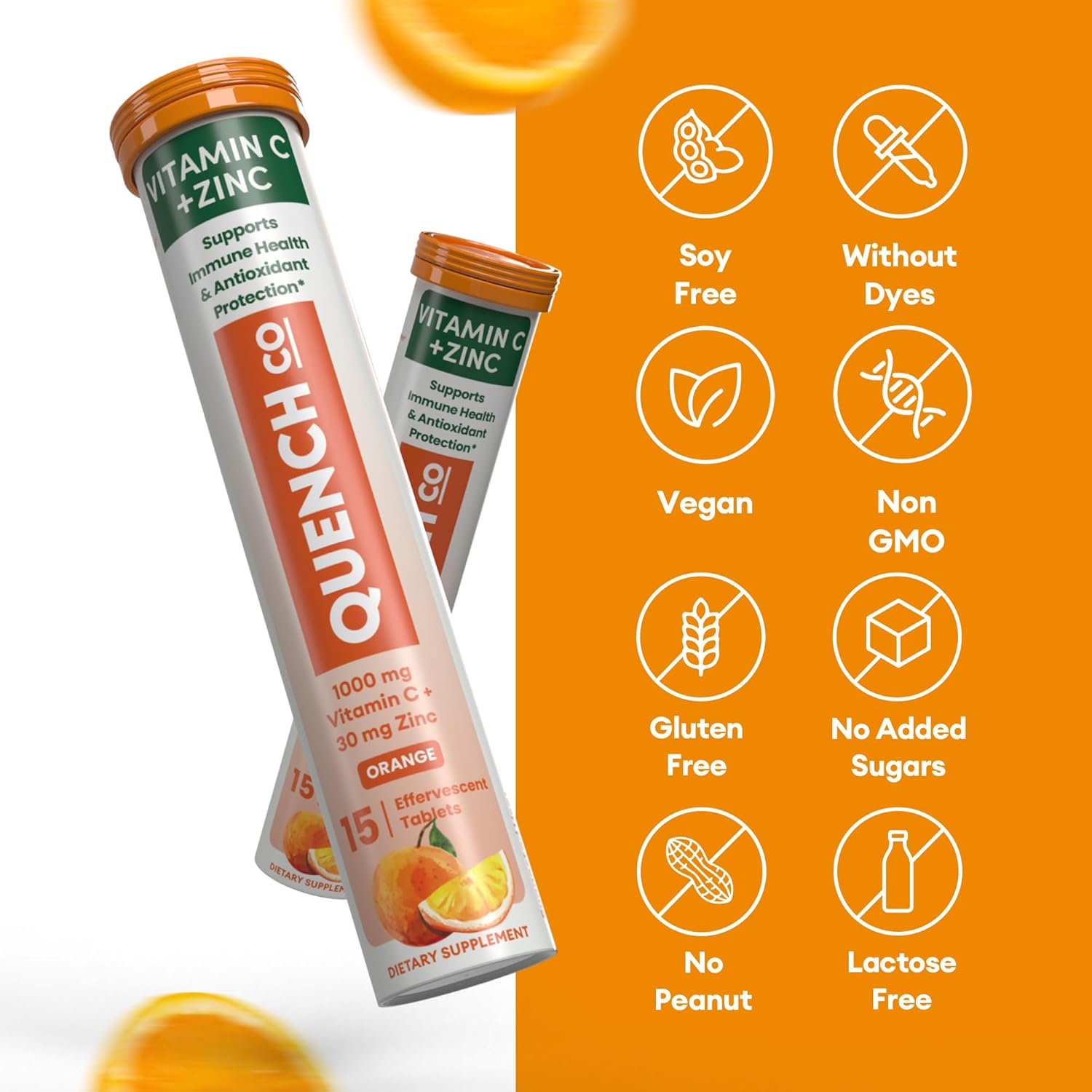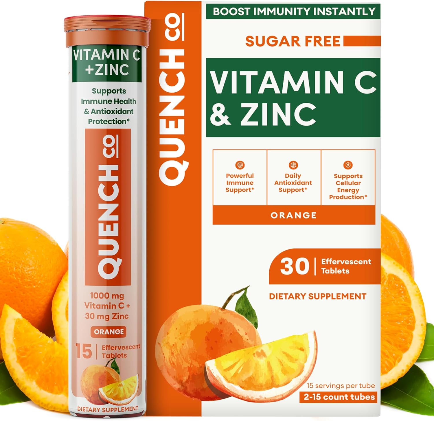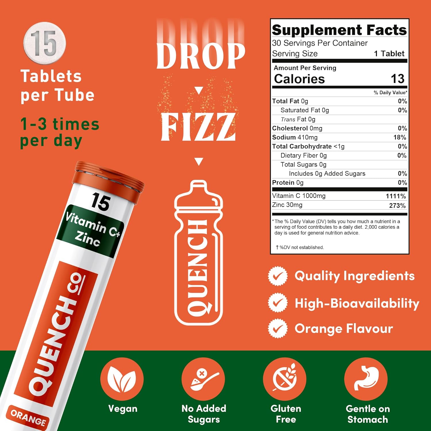 Quench Vitamin C & Zinc Effervescent Tablets – 1000mg, Sugar-Free, Immune Support Supplement, Includes Electrolytes, Orange Flavor Fizzy Drink – 30 Count