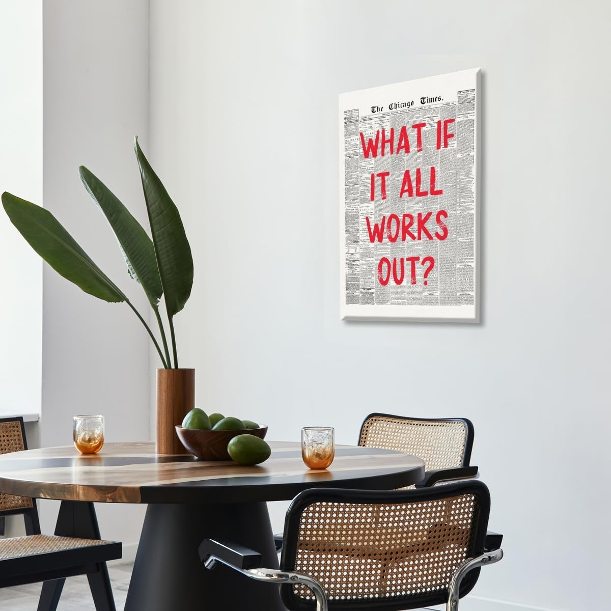 Brighten your house and your mindset with this encouraging wall print: “What if all of it works out?” Designed with crimson daring lettering over a nostalgic newspaper-style canvas, this piece is each visually compelling and emotionally empowering.
