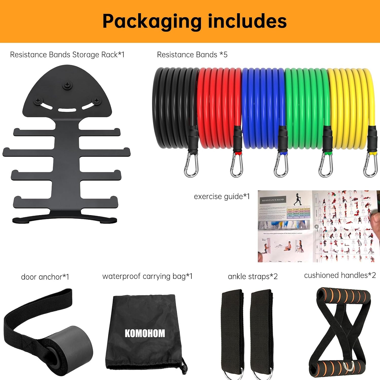PERSONAL HOME GYM RESISTANCE BAND SET INCLUDES: 5 train bands, 1 Resistance Bands Storage Hanger, 1 door anchor, 2 cushioned handles, 2 ankle straps, 1 train information, and 1 waterproof carrying bag. These parts will let you carry out the widest number of resistance coaching workout routines doable at house.
