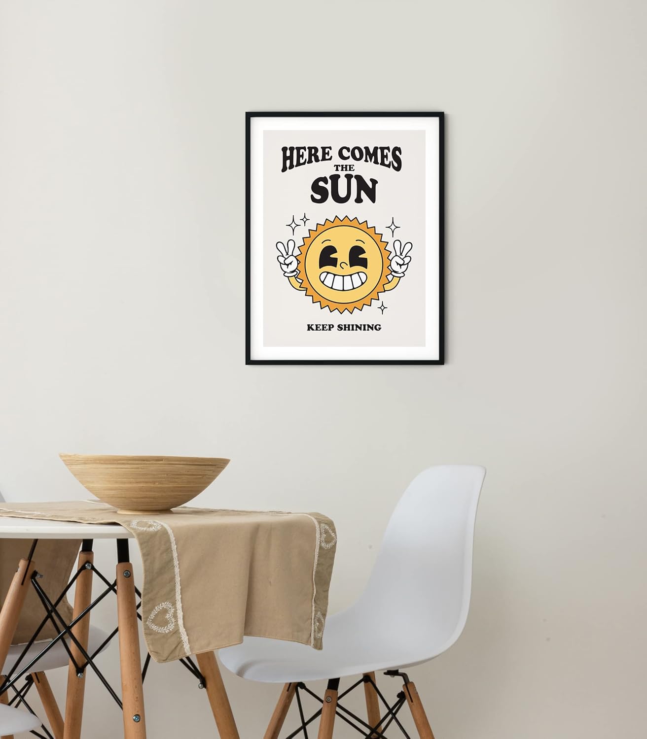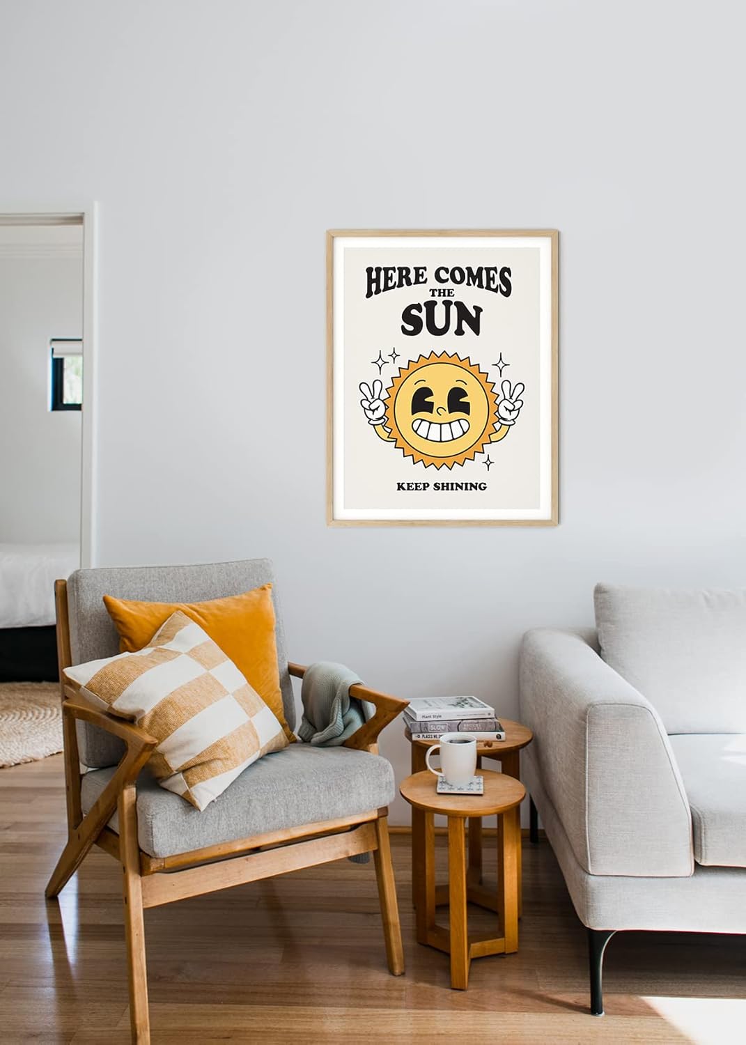 Retro Poster – Go retro with this aesthetic wall artwork print. That includes a enjoyable, nostalgic 60’s and 70’s type retro character and constructive quote – Right here Comes The Solar, Hold Shining