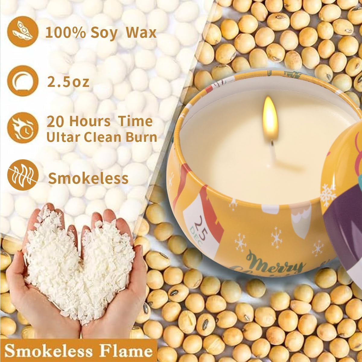Christmas Candles GiftsChristmas Candles Gifts Beautiful Aromatherapy Candle √ 100% pure soy wax √ Smokeless √ 2.5oz √ 20 Hours Time √ Reused Cute Tin Container √ Present field packaging