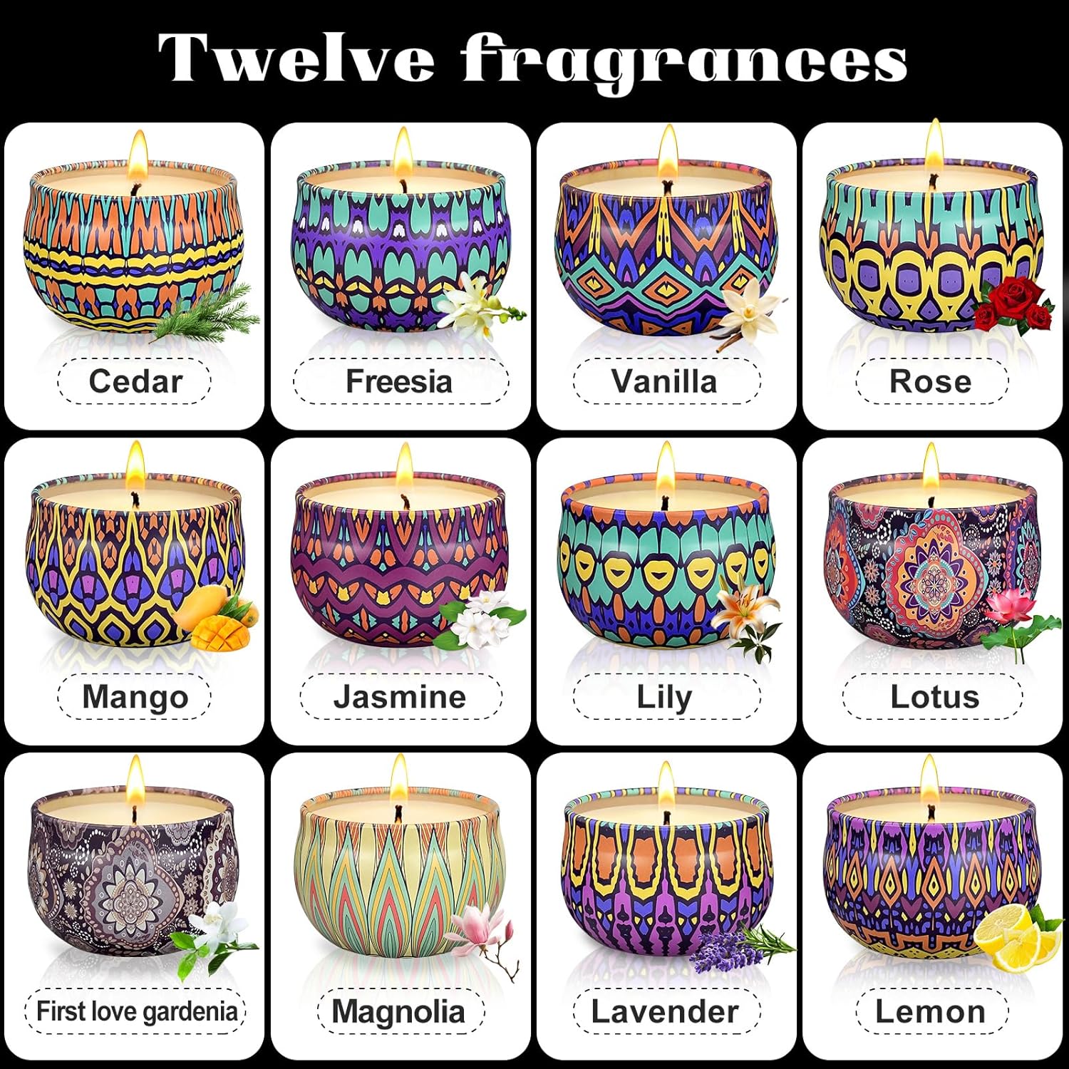 48 Pack Scented Candles Present Set – Accommodates 12 Scents:Jasmine ,Lavender, Lilac, Lemon, Gardenia, Vanilla, Cedar, Mango, Rose, Magnolia, Lotus flower, Freesia