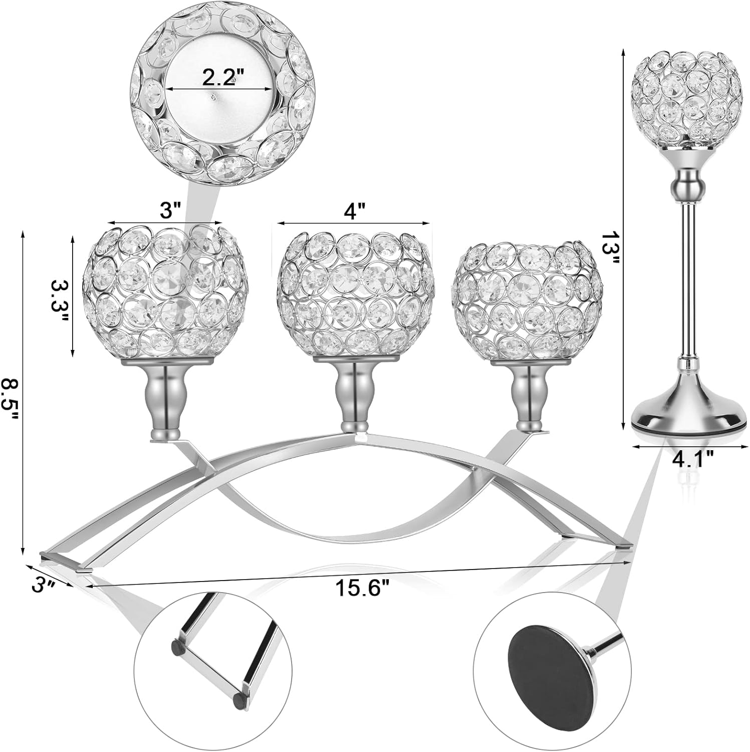 Silver Crystal Candle Holders Decorative Arch Candelabra 3-Arm Candlesticks Holder & 2 Glass Holders Table Centerpiece, Wedding, Party, Anniversary