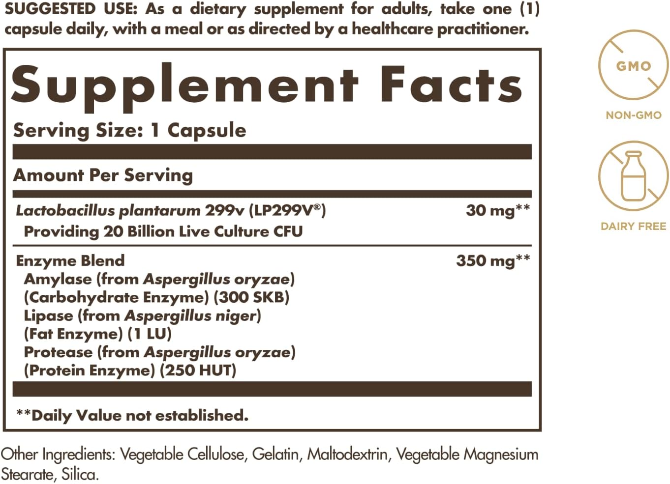 Probiotics PLUS Enzmes; Solgar Probi Plus Enzyme incorporates the closely studied LP299V probiotic pressure and is a robust mixture of 20 Billion CFU intestine-surviving probiotics plus 3 fermentation-based complementary enzymes