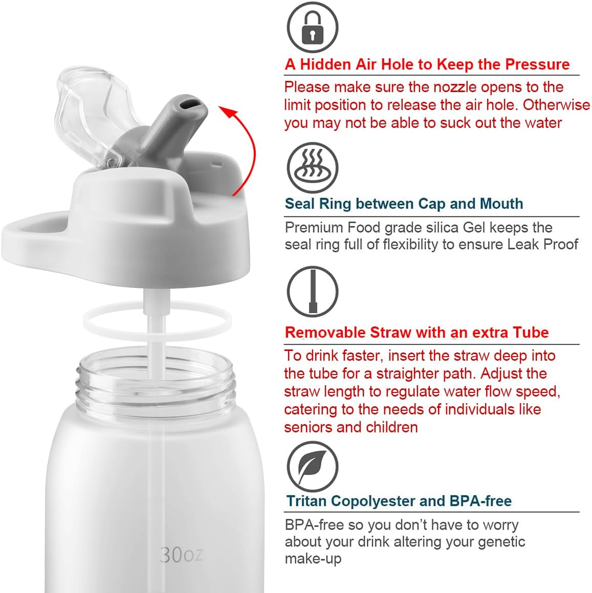 Designed for conveniently detaching and cleansing. The straw with an additional detachable silicone tube to make sure you drink all of the water within the bottle.