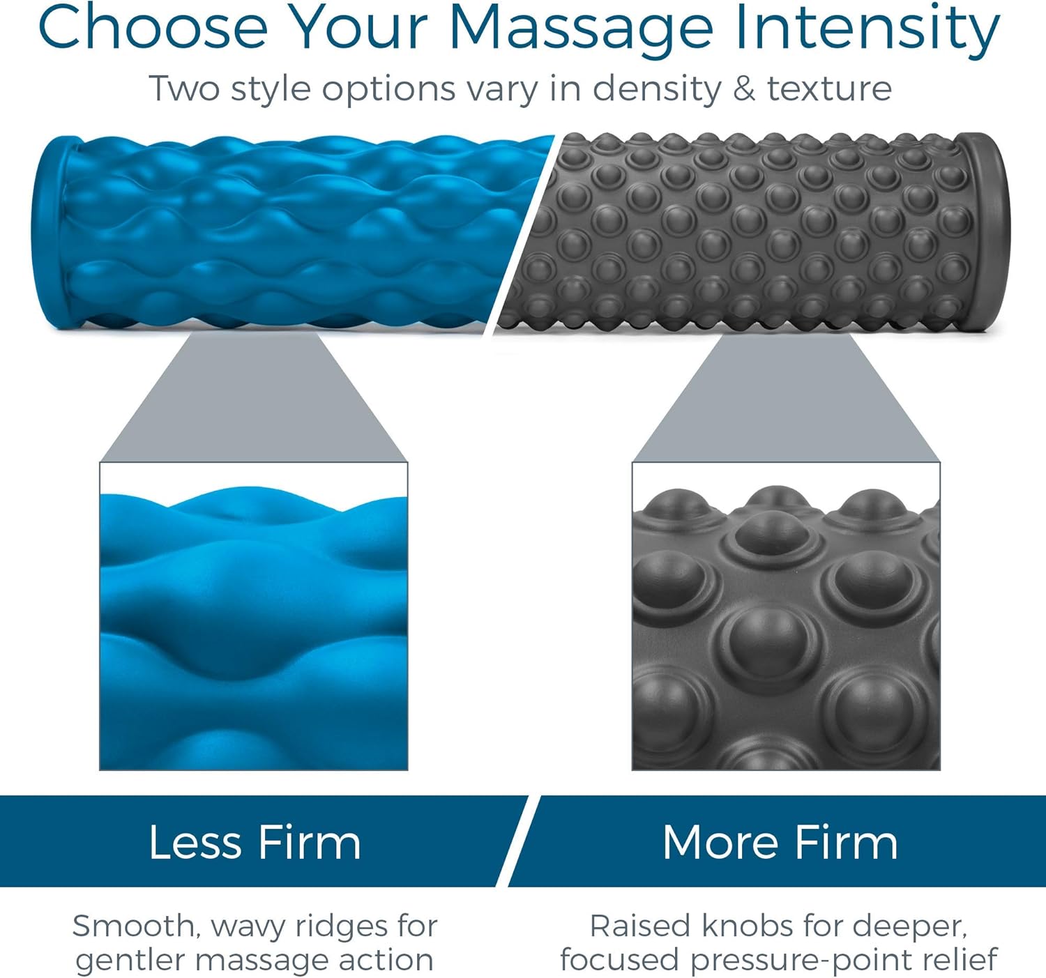 CHOOSE YOUR INTENSITY: The blue curler is the gentler choice, designed with delicate “wavy” ridges and barely much less agency foam wrapping. The grey curler is extra agency, with a “bumpy” design that mimics fingertips for deeper, extra centered pressure-point reduction.