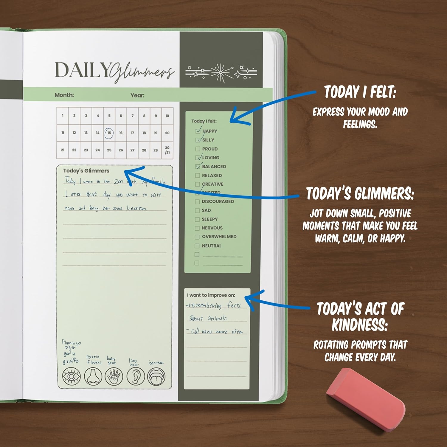 Nurture Glimmers & Emotions: Discover your happiest moments with particular sections for “Right now’s Glimmers” and “How I Really feel Right now.” This pocket book is sort of a treasure chest on your small joys and massive emotions. Writing about your glimmers might help you’re feeling relaxed, encourage happiness, suppose constructive ideas, and perceive your self higher!