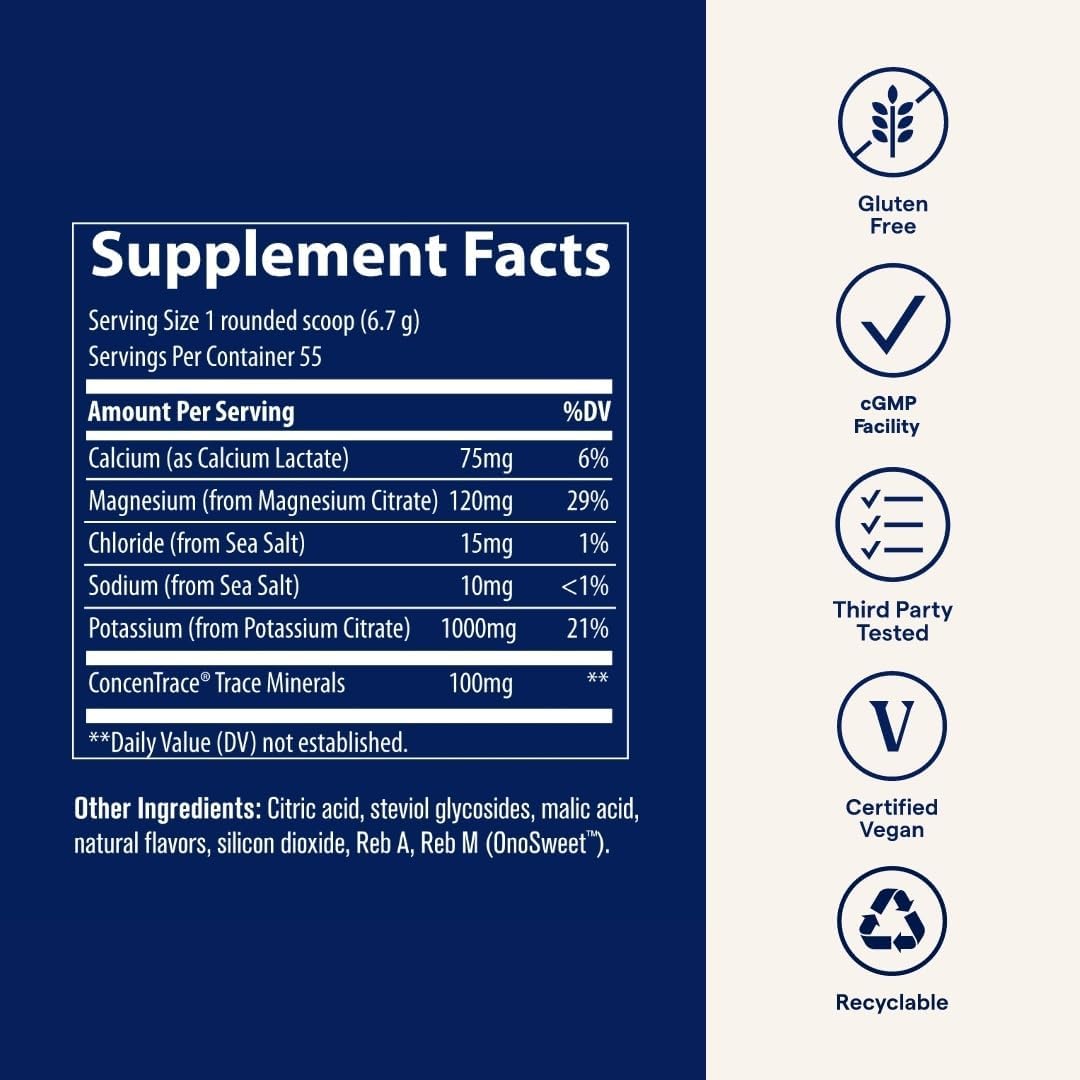 Complement with Important Minerals: Every serving contains 500mg magnesium, 300mg potassium, 700mg sodium, and 250mg chloride to help electrolyte steadiness