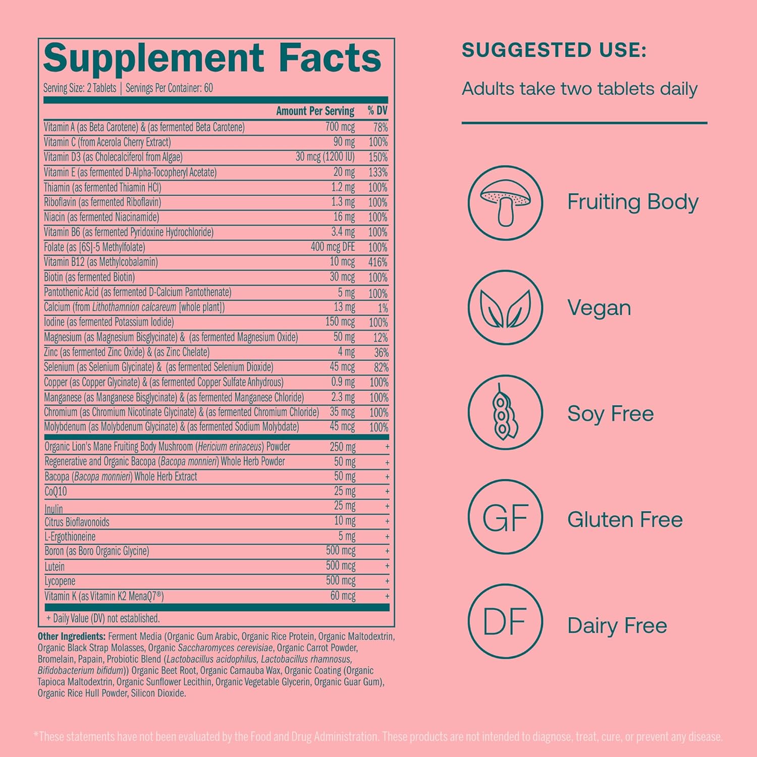 KEY INGREDIENTS – L-ergothioneine for longevity and mind well being. CoQ10 for antioxidant help. 150% DV vegan Vitamin D3 for bone & immune well being. Coenzyme B Nutritional vitamins for power. Fruiting physique natural lion’s mane with bacopa for reminiscence help.